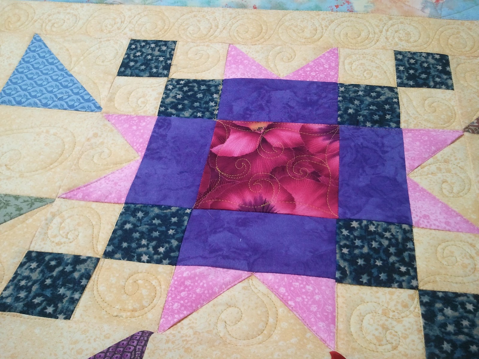 You might be wondering why the quilt seems "wrinkly" while I'm quilting it. Lately I've been stabilizing the whole quilt 1st, then going back to do more quilting. So after stabilizing, the quilt gets rolled backwards back onto the bottom bar as I quilt bottom to top. When I reach the top, I start on the borders and work my way back down. If necessary, after the top & bottom borders are done, I turn the quilt to do the last 2 borders at once rather than start-n-stop while rolling. Where the quilts been rolled onto the take-up bar as you see in this last pic, that's when it gets a little wrinkled but all the wrinkles come out!