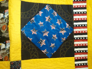Pat has a relative coming "home" from Afghanistan. Soon! Pat & her friends had made this quilt for him-- had promised him, in fact, just come home safely and WE will make you a quilt- we don't want you injured to need the QOV. We'll take care of it. And they did! Isn't this GREAT for the back?